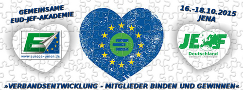 Die Europa-Union und die JEF für die Zukunft fit machen! Das ist das Ziel der gemeinsamen Akademie am 17. und 18. Oktober 2015 in Jena. Aktive aus EUD und JEF arbeiten gemeinsam zwei Tage lang an Ideen und Formaten für die Zukunft. Denn Herausforderungen gibt es genug: Wie dem demographischer Wandel begegnen? Und wie Mitglieder gewinnen und binden? Eins ist sicher: Nur gemeinsam können EUD und JEF vorankommen. » weiterlesen