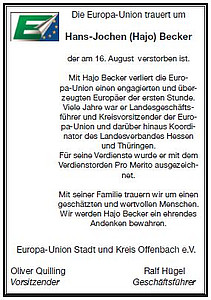 Die Europa-Union trauert um Hans-Jochen (Hajo) Becker, der am 16. August verstorben ist. Mit Hajo Becker verliert die Europa-Union einen engagierten und überzeugten Europäer der ersten Stunde.   » weiterlesen