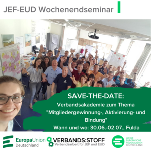 Nach vierjähriger Pause veranstalten JEF und Europa-Union vom 30. Juni bis 2. Juli 2023 wieder eine Verbandsentwicklungs-Akademie, bei der sich Aktive aus dem gesamten Bundesgebiet treffen. Im Fokus des praxisorientierten Wochenendseminars stehen die Mitgliedergewinnung, die Bindung und Aktivierung von Mitgliedern sowie die Widerstandsfähigkeit im Ehrenamt. » weiterlesen