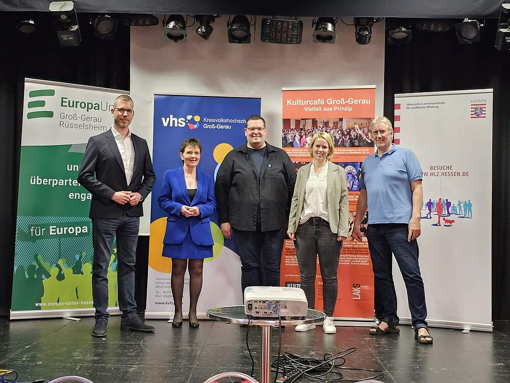 Als überparteiliche Europa Union Kreisverband Groß-Gerau kooperierten wir mit der Hessischen Landeszentrale für politische Bildung Wiesbaden, dem Kulturcafe Verein Groß-Gerau und der Kreisvolkshochschule Groß-Gerau. Unsere Kooperationspartner waren vertreten durch Jana Nathalie Burg, Referatsleiterin für Europa und Internationales bei der Hessischen Landeszentrale für politische Bildung, Walter Seeger, ehemaliger Vorsitzender des Kulturcafe Vereins e.V Groß-Gerau und Dr. Stefan Hebenstreit.