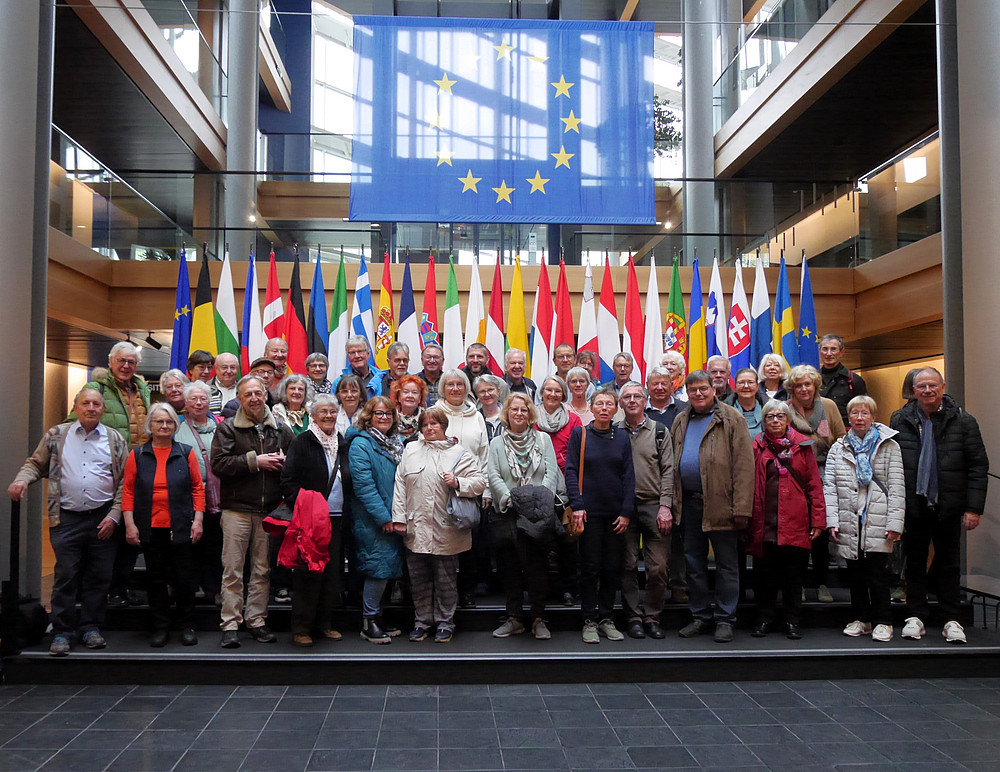 Der kulturellen und politischen Studienreise ins Elsass zum Europa-Parlament nach Straßburg und nach Colmar folgten 48 Wetterauer Bürgerinnen und Bürger auf Einladung der Europa-Union Wetterau. Erste Anlaufstelle auf dem Weg zum Quartier in Colmar war das mittelalterliche Städtchen Obernai im Herzen des Elsass und am Fuße des Odilienbergs. Zwei Stadtführer nahmen die Gruppe in Empfang und zeigten ihr alle wichtigen Sehenswürdigkeiten, die sie mit lebendigen Geschichten umrahmten. Danach ging die Fahrt entlang der elsässischen Weinstraße weiter nach Colmar. Nach der Einquartierung im Hotel schlossen die Wetterauer und Wetterauerinnen den Tag mit einem elsässischen Menü in einem typisch elsässischen Lokal ab. Am nächsten Morgen begann der politische Teil der Reise im Bus auf dem Weg nach Straßburg ins Parlament. Vorstandsmitglied Peter Bauch, Politologe und Politikberater aus Bad Vilbel bereitete die Mitfahrenden auf den Besuch des Europaparlamentes vor, indem er drei Kernbereiche der Europäischen Union aufzeigte. Zunächst benannte er die EU als Friedensprojekt, ausgehend von der Erklärung des französischen Außenministers Robert Schumann am 9. Mai 1950, die die Zukunft unseres Kontinents verändern sollte. Der französische Außenminister hat sich zum Ziel gesetzt eine neue supranationale Organisation zu schaffen und zwischen Frankreich und Deutschland ein gemeinsamer Markt für Kohle und Stahl zu gründen, der auch offen stand für den Beitritt weiterer europäischer Länder. Mit der Gründung der Europäischen Gemeinschaft für Kohle und Strahl (EGKS) begann die Entwicklung zur Europäischen Union, ein Projekt, das uns fast 80 Jahre den Frieden der europäischen Länder untereinander brachte. Als zweiten Kernbereich nannte Bauch, die EU als den größten Staatenbund der Welt, indem alle Staaten sich in nationalen Verfassungen dem freiheitlichen Wertesystem verpflichteten und das durch Demokratie, Menschenrechte und Rechtsstaatlichkeit geprägt ist. Als dritten Kernbereich der EU bezeichnete er den erfolgreichen Binnenmarkt mit sozialer Stabilität. Bauch nannte die EU einen Sehnsuchtsort, der nicht umsonst von vielen Menschen in der Welt als solcher gesehen wird. Nur ein vereintes Europa sichere unsere Stellung in der Welt und könnte nur zusammen mit den Wirtschaftsmächten USA und China mithalten. Mit Blick auf die anstehende Europawahl meinte der Referent, dass die drei genannten Kernbereiche nur gehalten und weiterentwickelt werden könnten, wenn die proeuropäischen Kräfte weiterhin im EU-Parlament eine starke Mehrheit behalten und nationalistische, populistische und antieuropäische Kräfte keinen Einfluss auf die Politik im Parlament erhalten würden. Bei der Führung durch das Europäische Parlament, in dem keine Sitzung stattfand, erteilte die Führerin eine umfassende Erläuterung zur Arbeitsweise des Parlaments, das mit seinen 705 Abgeordneten Entscheidung en und Rechtsvorschriften vorbereitet und verabschiedet. Für den Dolmetscherdienst ist es eine Mammutaufgabe die Beiträge und Reden der Abgeordneten in 24 Sprachen simultan zu übersetzen.