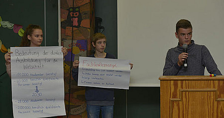 Überhaupt wäre es sicher dienlich gewesen, gerade auch im dritten Teil den europäischen Aspekt noch mehr zu betonen. Dass dies nicht passierte, hängt sicher damit zusammen, dass Studiensemester oder Ausbildungsabschnitte im Ausland ebenso wie Aufenthalte dort bereits während der Schulzeit von den Schülern heute als Selbstverständlichkeiten wahrgenommen werden. Immerhin gab es den Hinweis auf die inzwischen vereinheitlichten Studienabschlüsse und Anerkennungsregelungen. Und dass ein Studium gegenüber einer Ausbildung nicht automatisch zu einer besser bezahlten Berufstätigkeit führen muss, ist sicher eine Wahrheit, die an den Schulen angesichts des zunehmenden Fachkräftemangels gar nicht oft genug ausgesprochen werden kann.