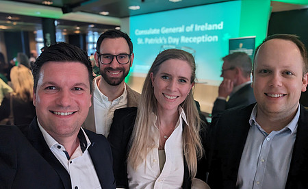 Eine Einladung zum Empfang der Botschaft der Republik Irland zur Feier des St. Patrick's Day erhielten kürzlich Sven Ringsdorf (Vorsitzender), Tom Amadé Diehl, Stefanie Raab-Faber und Alexander Paff von der überparteilichen Europa-Union Lahn-Dill. Die deutsche Ausgabe der Feierlichkeiten fand in diesem Jahr im Deutschen Filmmuseum in Frankfurt am Main statt. Eine handverlesene Anzahl an Gästen konnte der Ansprache des irischen Staatsministers Martin Heydon und Botschafter Nicholas O'Brien lauschen, ehe mit Folklore, Tanz, Musik und irische Köstlichkeiten ein würdiger Festrahmen folgte. Der amtierende Generalkonsul Patrick Jacques, Generalkonsulin Anne-Marie Flynn und stellv. Generalkonsul Aaron Reen freuen sich auf das fünfte Jahr irischer Freundschaft mit/ nach Wetzlar. Das 2019 eröffnete Konsulat hatte 2020 Kontakte nach Wetzlar geknüpft, die bis heute von der überparteilichen Europa-Union gepflegt und gefördert werden. So stehen in diesem Jahr wieder spannende Formate in den Europawochen an. Bereits zum dritten Mal findet das inzwischen beliebte PubQuiz zu Irland und Europa am 24. Mai 2024 im Carrol's Pub am Eisenmarkt in Wetzlar statt, wobei die Diplomaten das Siegerteam wieder auszeichnen wird.