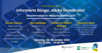 Tauchen Sie ein in den Online-Bürgerdialog "Informierte Bürger, starke Demokratie! Desinformation vor den Europawahlen 2024" am 28.11.2023 von 17:30 bis 19:00 Uhr. Gemeinsam mit Alexandra Geese,…