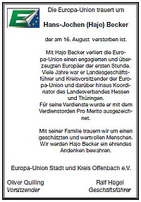 Die Europa-Union trauert um Hans-Jochen (Hajo) Becker, der am 16. August verstorben ist. Mit Hajo Becker verliert die Europa-Union einen engagierten und überzeugten Europäer der ersten Stunde.